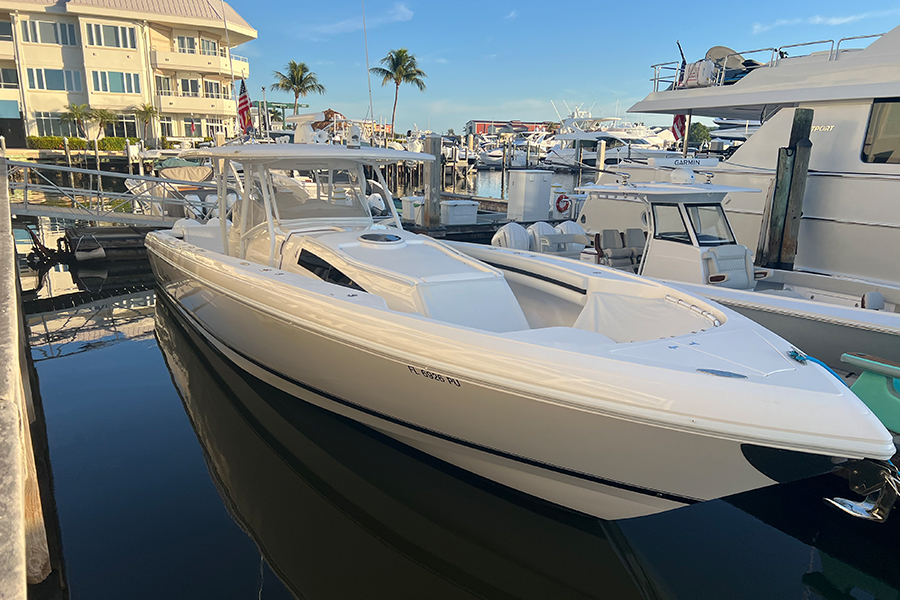 The open cockpit provides ample room for lounging, while the hull-side dive door (a signature Intrepid feature) makes dipping into the turquoise Gulf waters of Naples and Marco effortless.