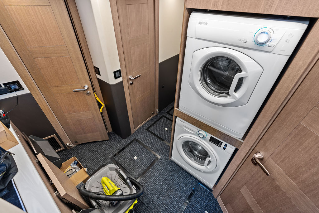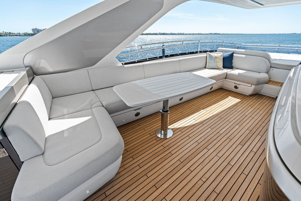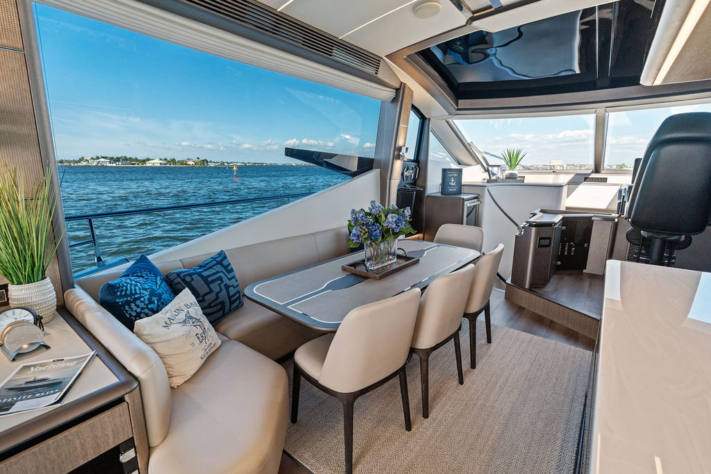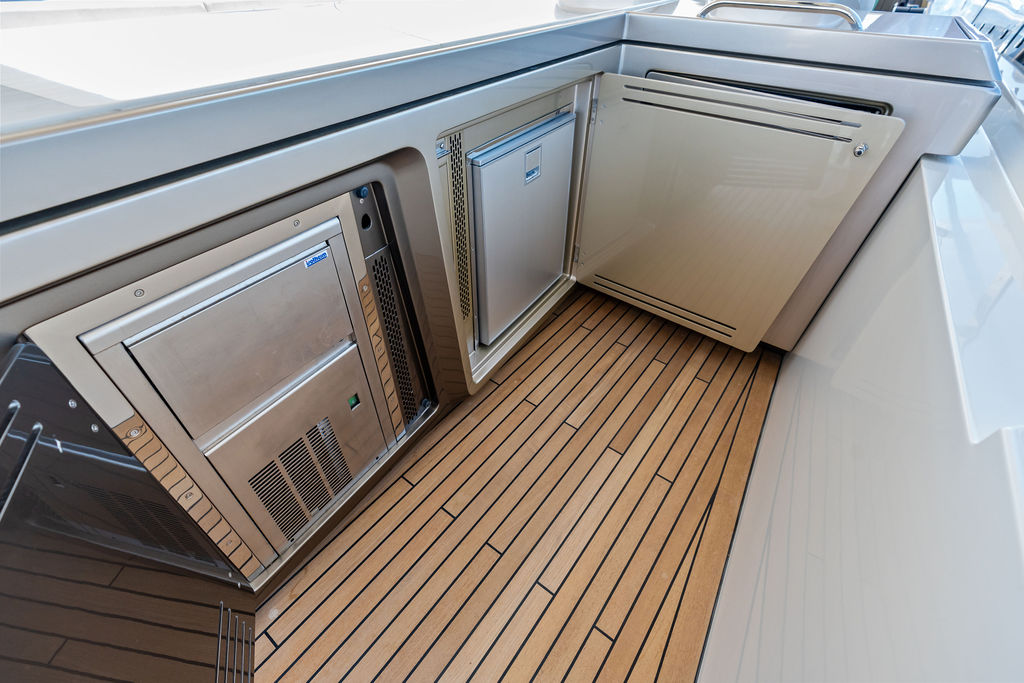 The Flybridge: Often described as the largest in its class, the flybridge is the heart of the social experience. It features a carbon-fiber hardtop, a fully equipped bar, an electric grill, and a Jacuzzi. With multiple semicircular sofas and dining tables, it can comfortably accommodate up to 14 guests for a sunset dinner with 360-degree views.