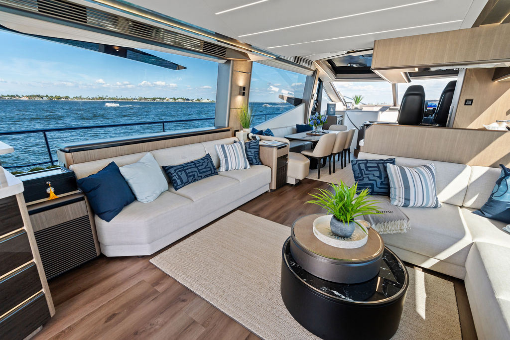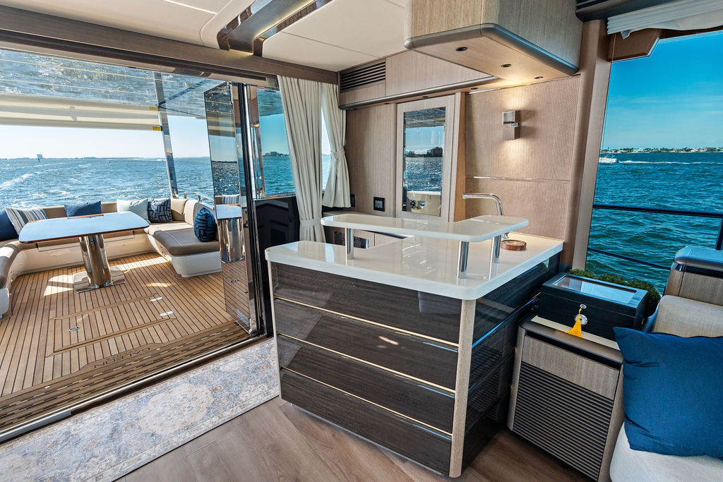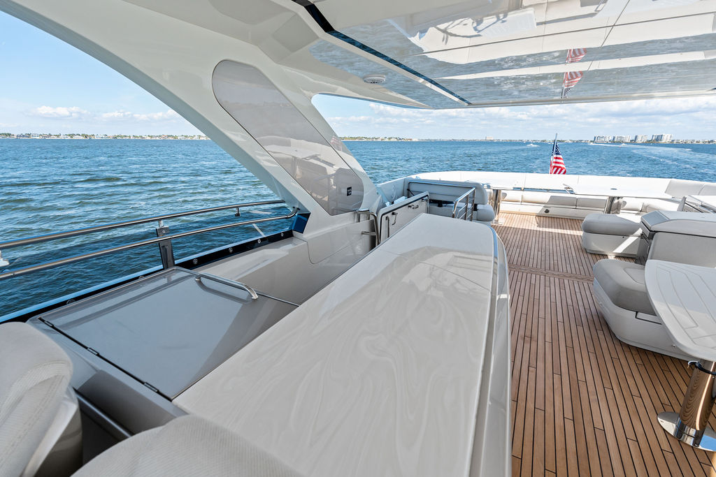 One of the most talked-about features of the Galeon line is its innovative “Beach Mode.” On the 800 Fly, this translates to hydraulic fold-out balconies that extend the beam of the yacht, transforming the cockpit into a massive, open-air terrace. This creates a seamless connection with the turquoise waters of the Gulf, allowing you to enjoy a cocktail at the integrated bar while literally hovering over the gentle surf.