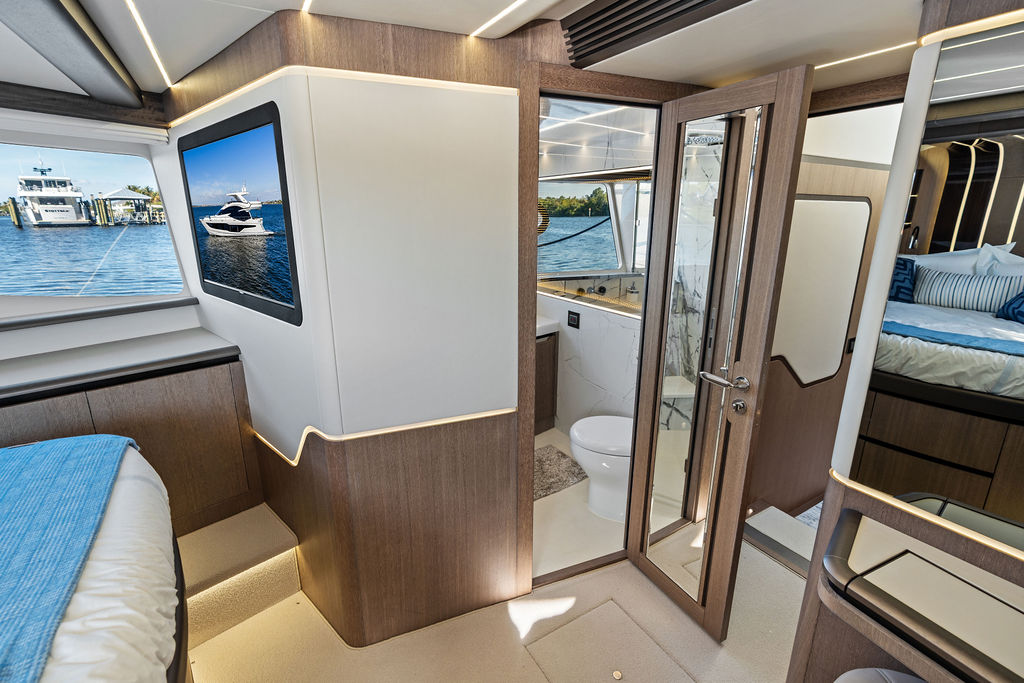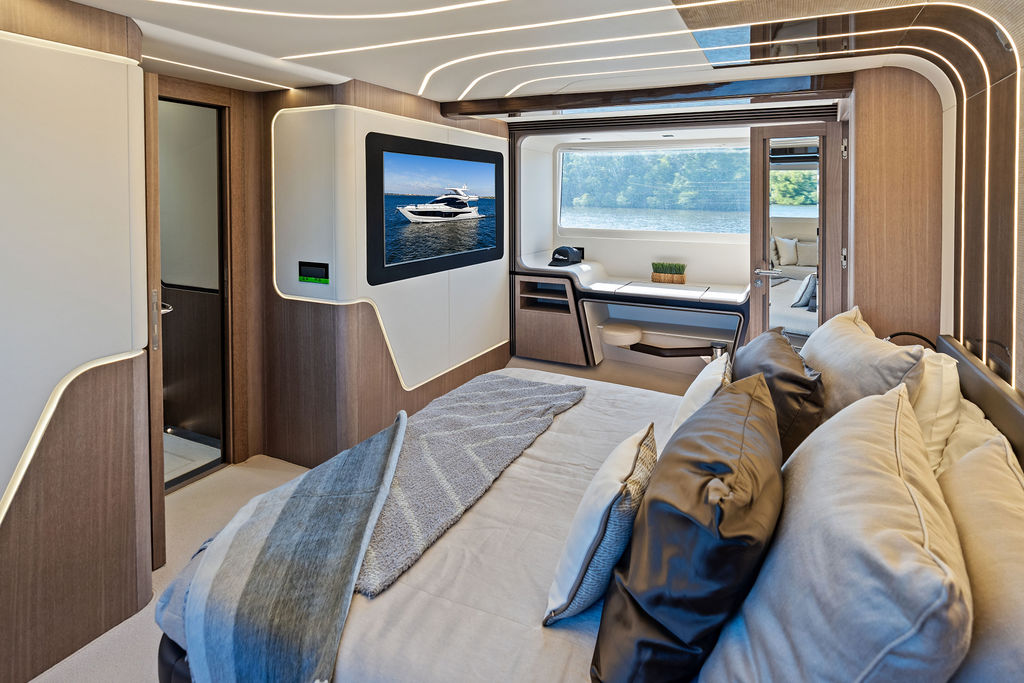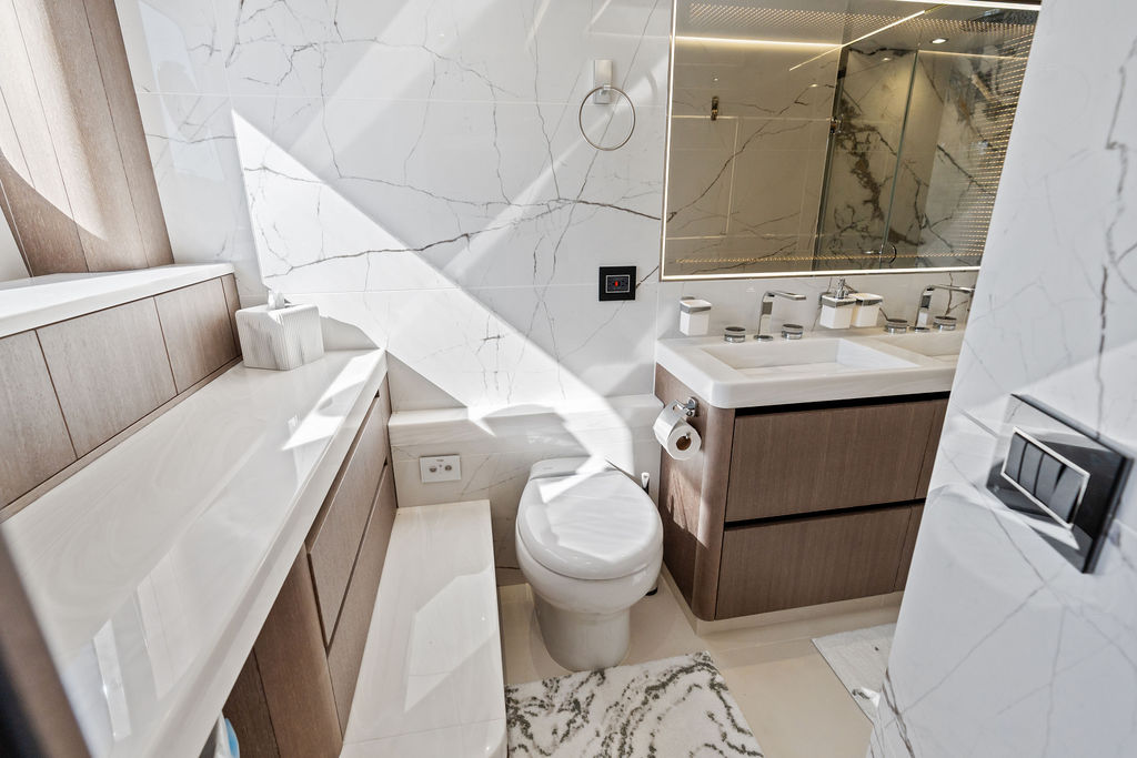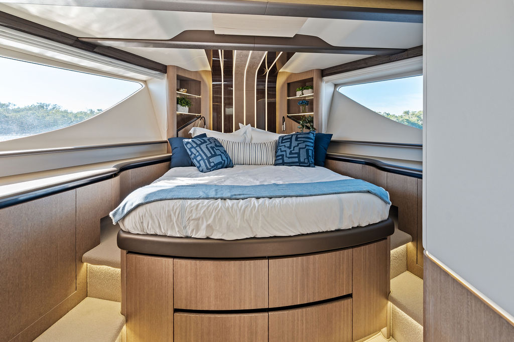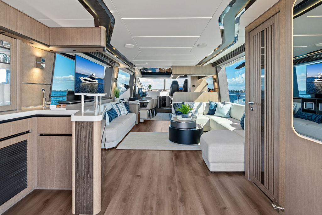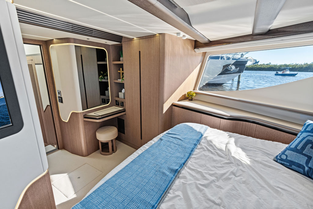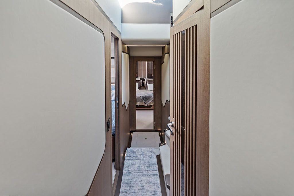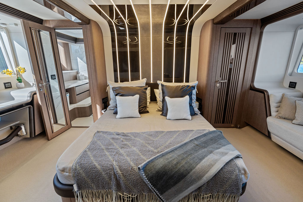 The Interior: Step inside the main salon, and you are greeted by floor-to-ceiling windows that flood the space with natural light. The interior styling is a masterclass in modern luxury, featuring hand-crafted woodwork, a gourmet galley with a kitchen island, and a separate day head for guests.